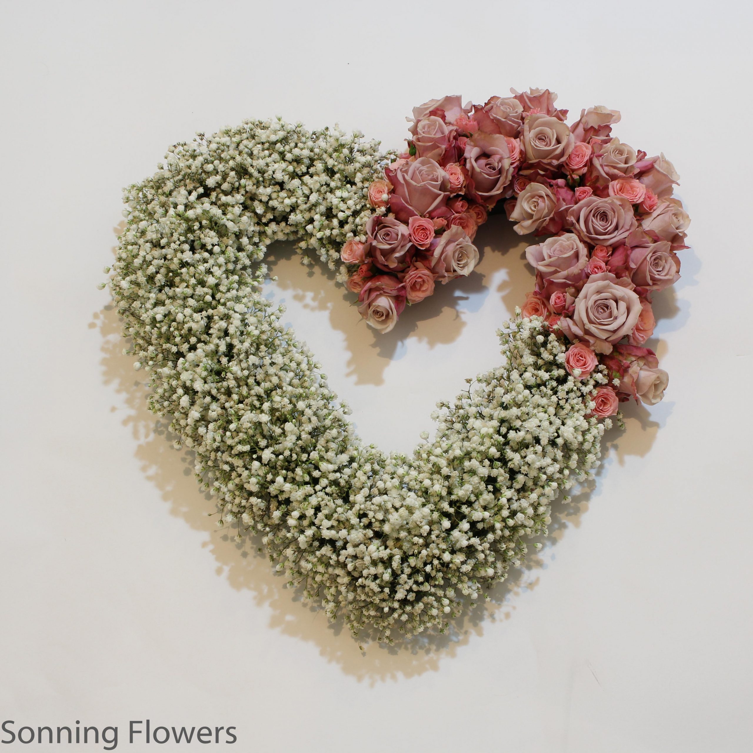 A heart shaped funeral tribute with packed gypsophilia and roses.